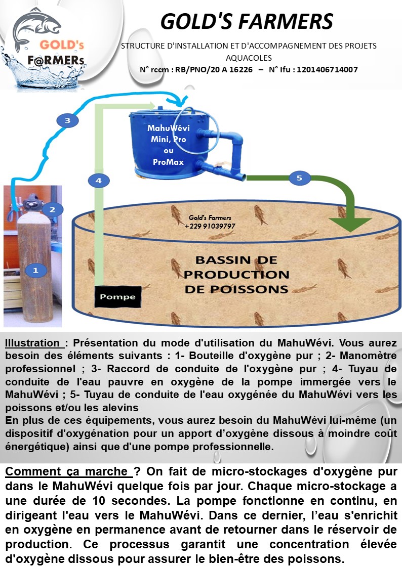 The MahuWévi oxygenation technology addresses critical challenges in African aquaculture, including low dissolved oxygen levels and high energy costs in fish farming. This innovative system enables significant oxygen enrichment in fish ponds through short, efficient oxygenation cycles, allowing for high fish yields with minimal environmental impact. Designed for ease of use and energy efficiency, MahuWévi enables production of multiple species, enhancing food security and empowering small-scale fish farmers, including women and youth, by providing a low-maintenance, affordable solution.